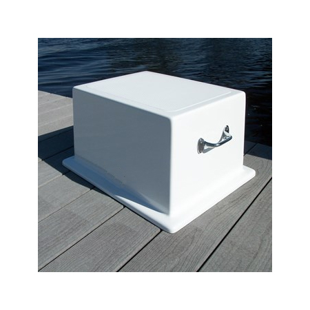 Captain Charlie’s Step Boxes Have Sleek Rounded Edges, Built in Non Skid Surface on Top of the Steps and chrome brass handles. This step box can hold up to 250 lbs. and has Ultra-violet resistant white gelcoat.